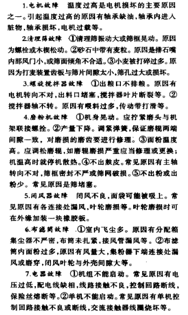 小型面粉機(jī)具有生產(chǎn)效率高、勞動強(qiáng)度低、磨粉質(zhì)量好等特點(diǎn),深受農(nóng)村加工專業(yè)戶的歡迎。使用中常見故障如下:電機(jī)故障,清理篩故障,螺旋攪拌器故障,磨粉機(jī)故障,閉風(fēng)器故障,布濾筒故障,電器故障,主要排除方法如下:
